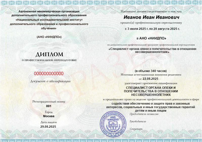 - Квалификация: Специалист органа опеки и попечительства в отношении несовершеннолетних