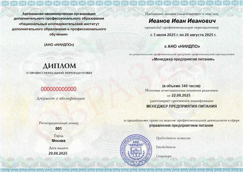 После итогового экзамена получают диплом о дополнительном профессиональном образовании. Присваивается квалификация «Управляющий на предприятии питания».