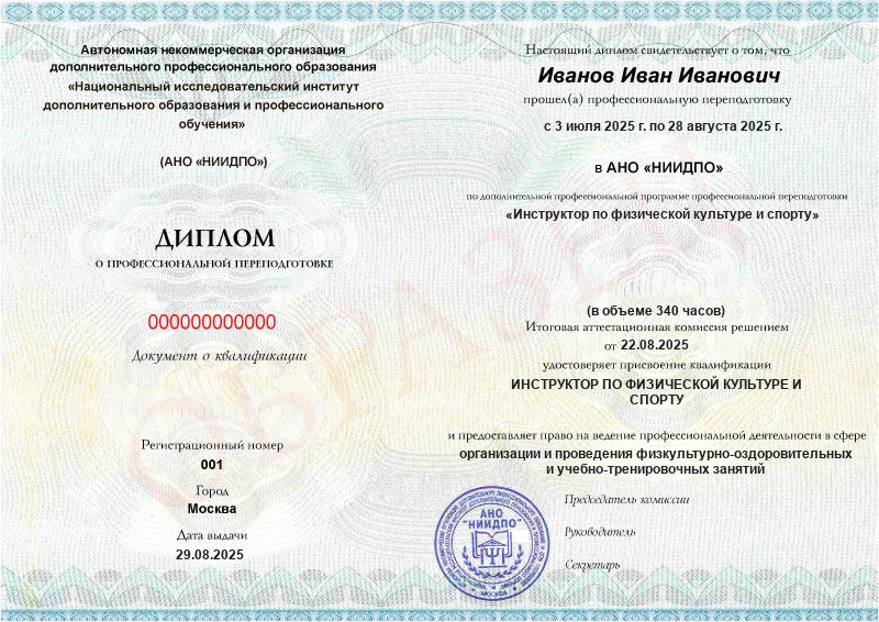 После сдачи экзамена выдается диплом о дополнительном профессиональном образовании с присвоением квалификации «Инструктор по физической культуре и спорту».