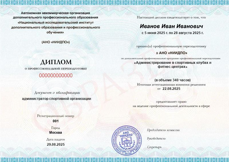 В конце программы предусмотрен итоговый экзамен. Выдают диплом о дополнительном профессиональном образовании с присвоением квалификации «Администратор спортивной организации».
