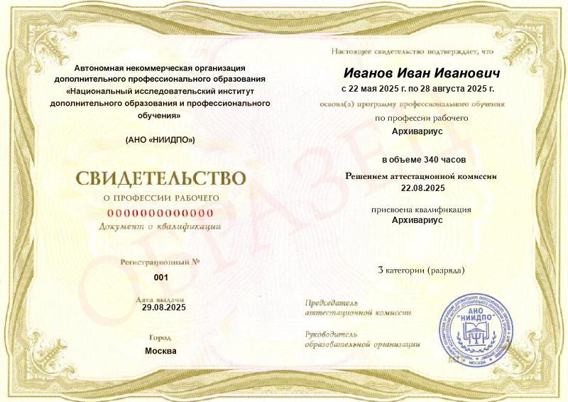 • Свидетельство о профессиональном обучении с присвоением квалификации архивариуса