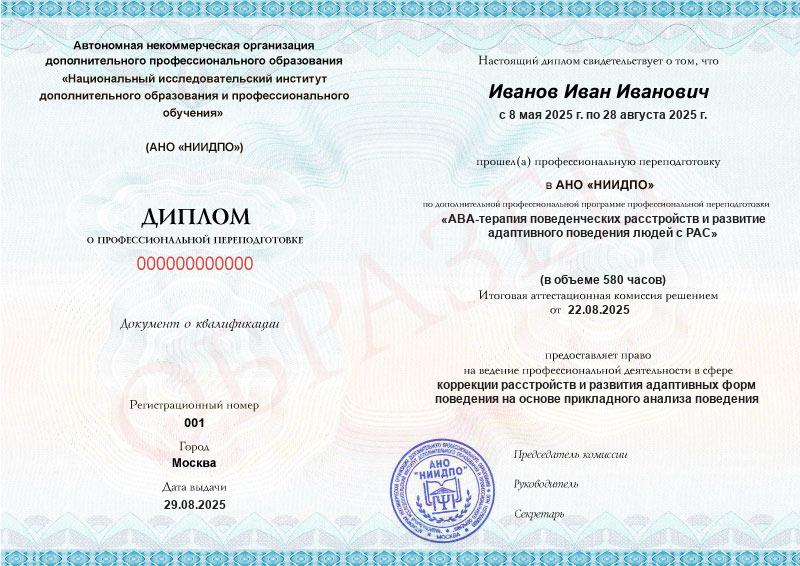 Диплом о профессиональной переподготовке от АНО «НИИПДО»Диплом действует на территории всей России и признается государственными и частными организациями