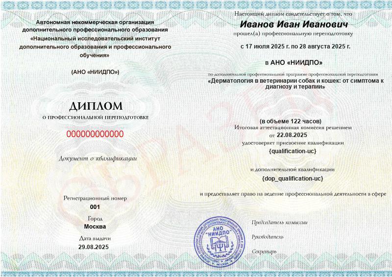 Выпускникам, успешно прошедшим итоговую аттестацию по дополнительным профессиональным программам, выдается документ о квалификации - диплом о профессиональной переподготовке или удостоверение о повышении квалификации. В соответствии с приказом Минобрнауки России от 24.03.2025 № 266 «Об утверждении Порядка организации и осуществления образовательной деятельности по дополнительным профессиональным программам», документ о квалификации выдается на бланке, образец которого самостоятельно устанавливается образовательной организацией.