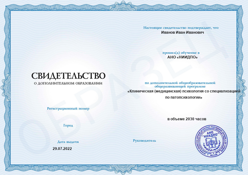 Учебный план дополнительной общеобразовательной программы «Клиническая (медицинская) психология со специализацией по патопсихологии»