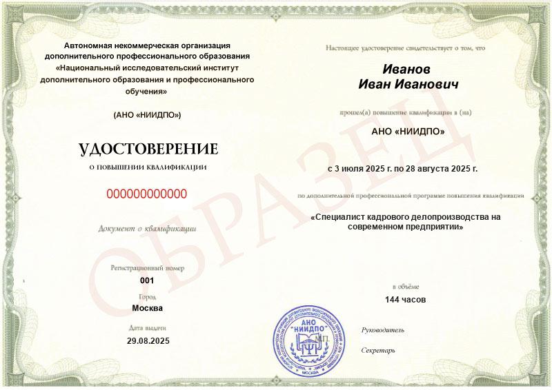 Специалист кадрового делопроизводства на современном предприятии (144ч)