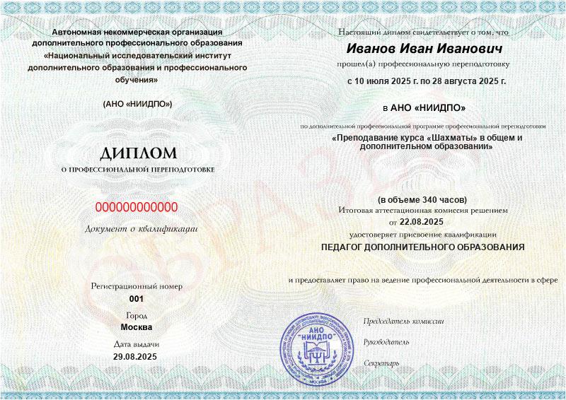 Отзыв об обучении в АНО ДПО «Национальный исследовательский институт дополнительного образования и профессионального обучения». Я прошёл курс профессиональной переподготовки по программе «Преподавание курса «Шахматы» в общем и дополнительном образовании» в АНО ДПО «Национальный исследовательский институт дополнительного образования и профессионального обучения» . Обучение проходило дистанционно, что было очень удобно. Все материалы были изложены понятно и доступно, платформа для обучения работала стабильно. Преподаватели оперативно отвечали на вопросы, давали подробные разъяснения. Особенно порадовало, что курс был ориентирован не только на методику преподавания шахмат, но и на общепедагогические знания, необходимые для успешной работы с детьми. Благодарю всю команду института за качественное обучение и профессиональный подход. Полученные знания и документы позволят мне уверенно работать по новой специальности. Рекомендую обучение в этом учреждении всем, кто хочет получить качественное образование и повысить свою квалификацию.
