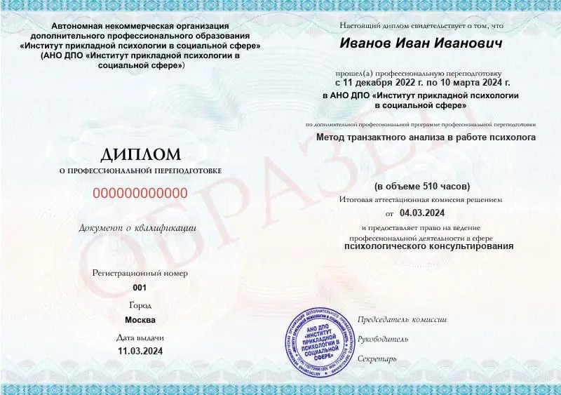 • Диплом о профессиональной переподготовке установленного образца с правом на ведение профессиональной деятельности в сфере психологического консультирования