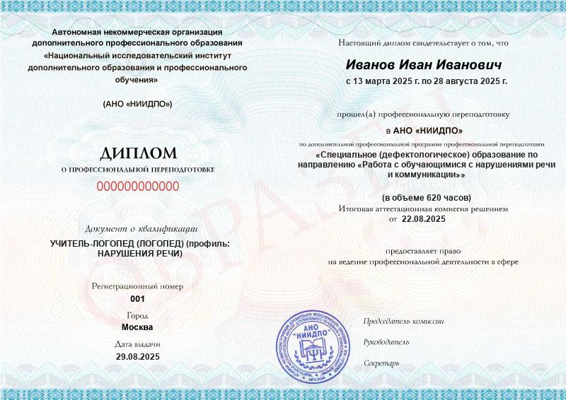 - Квалификация: УЧИТЕЛЬ-ЛОГОПЕД (ЛОГОПЕД) (профиль: НАРУШЕНИЯ РЕЧИ)