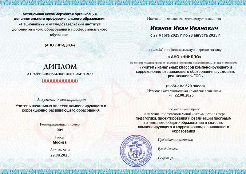 - Диплом о профпереподготовке с присвоением квалификации «Учитель начальных классов компенсирующего и коррекционно-развивающего образования».